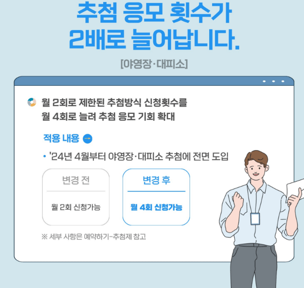 - 야영장과 대피소에서 운영하던 월2회로 제한된 신청을 월4회로 늘립니다.