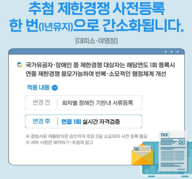 - 국가유공자·장애인 등 제한경쟁 대상자들은 해당연도 1회 등록하시면 연중 제한경쟁 응모가 가능합니다.