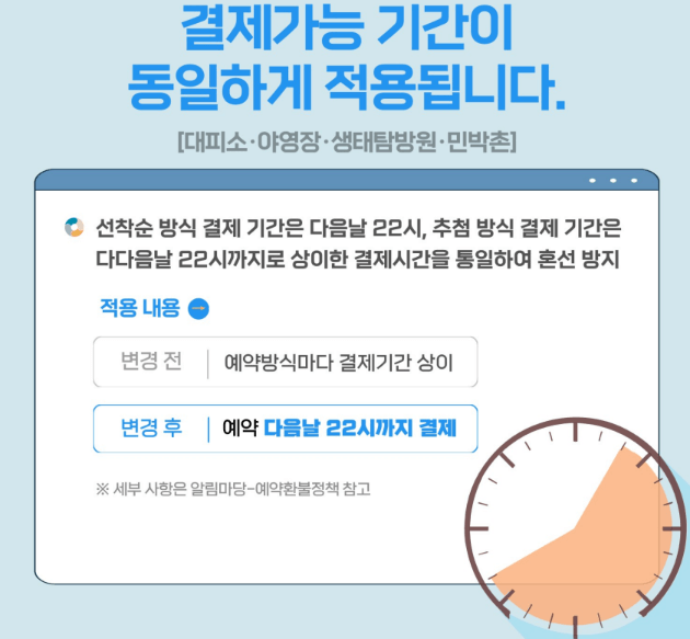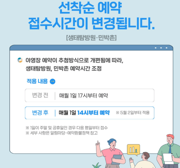 - 선착순 에약 접수시간이 변경됩니다. 야영장, 생태탐방원, 민박촌 예약시간 조정되었습니다.
