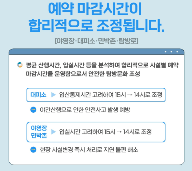 변경전 매월1일 17시부터 ☞ 변경후 매월1일 14시부터 예약 (2024년 5월 2일부터 적용) - 평균 산행시간, 입실시간 등을 분석하여 합리적으로 마감시간을 운영함으로 혼잡하지 않습니다.