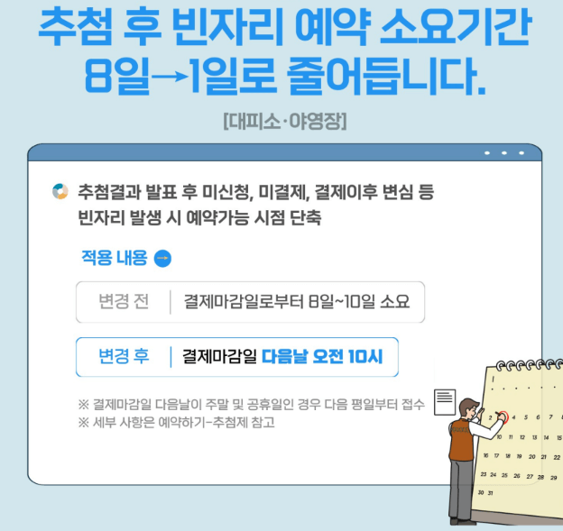 - 추첨 후 빈자리 예약 소요시간 단축 됐습니다.(8일 ☞ 1일로 줄어듭니다.)
