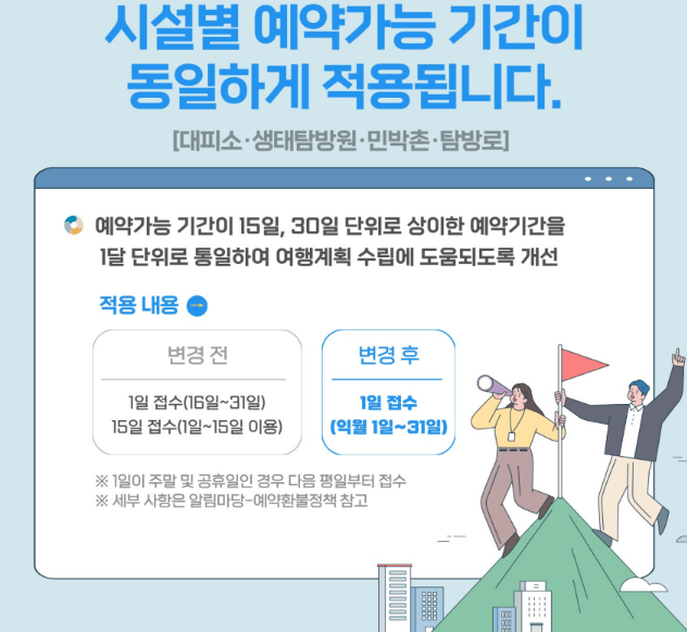 - 시설별 예약가능 기간이 동일하게 적용됩니다.(대피소·생태탐방원 ·민박촌 ·탐방로)