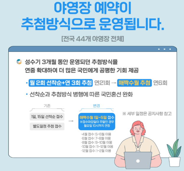 - 성수기에 3달동안 하던 추첨방식을 확대하여 더 많은 분들에게 동등한 기회를 제공합니다.